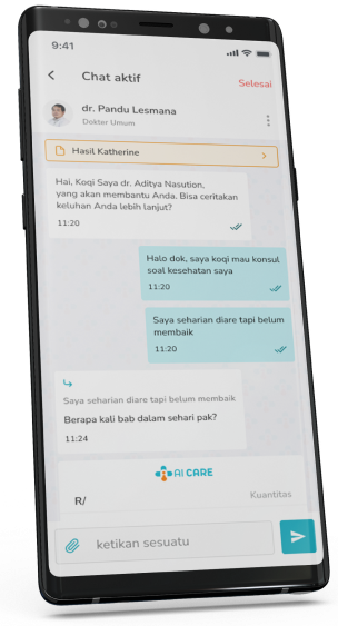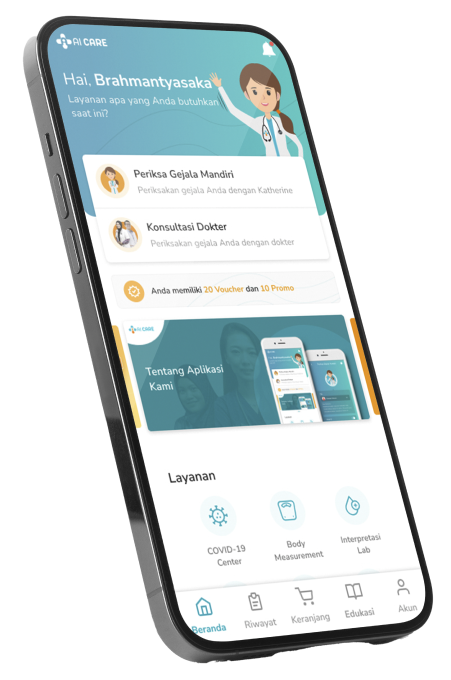 Konsultasi dokter adalah salah satu layanan utama aplikasi Ai Care di mana Anda dapat memeriksa gejala Anda secara virtual dengan dokter umum, dokter spesialis, serta tenaga kesehatan lainnya. Layanan ini berupaya memberikan pengalaman end-to-end di mana dokter dapat memberikan Anda edukasi, resep, atau rekomendasi rujukan yang sesuai dengan kondisi Anda. Layanan konsultasi dokter di Ai Care selalu mengusung nilai AI CARE: Accurate, In Safety, Confidential, Rapid Response, dan Expert.